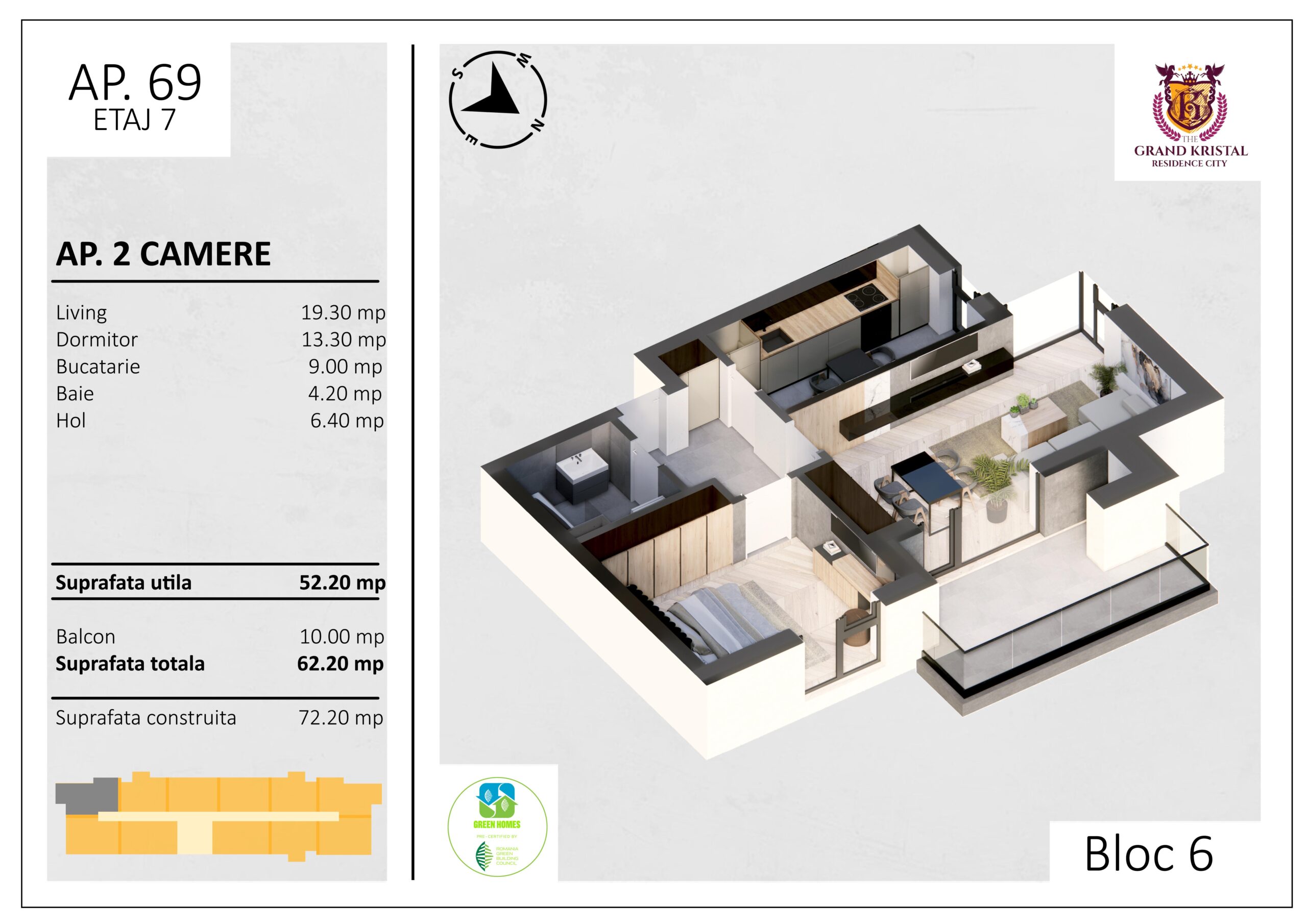 Suprafata utila totala: 62.2 mp