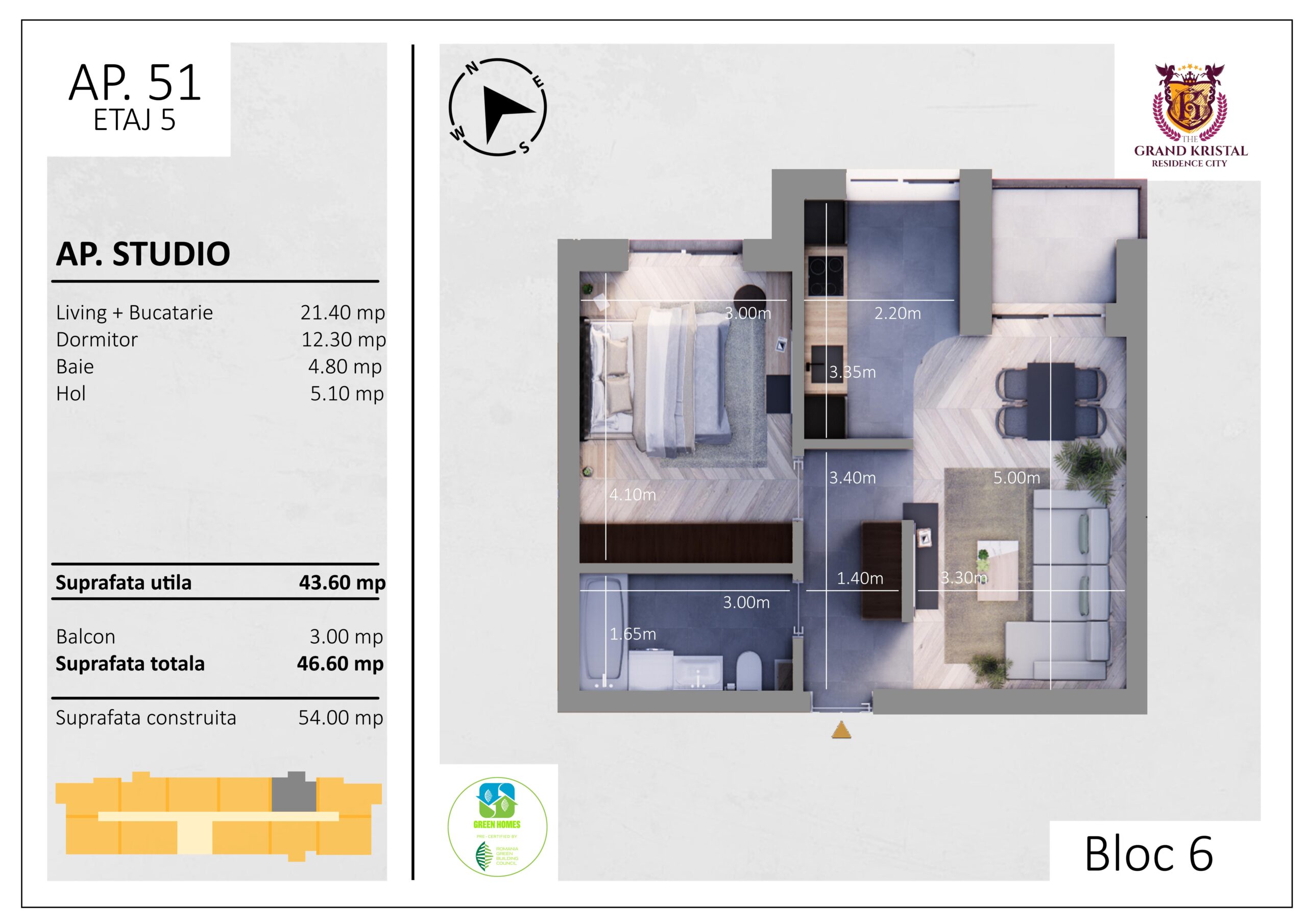 Suprafata utila totala: 46.6 mp